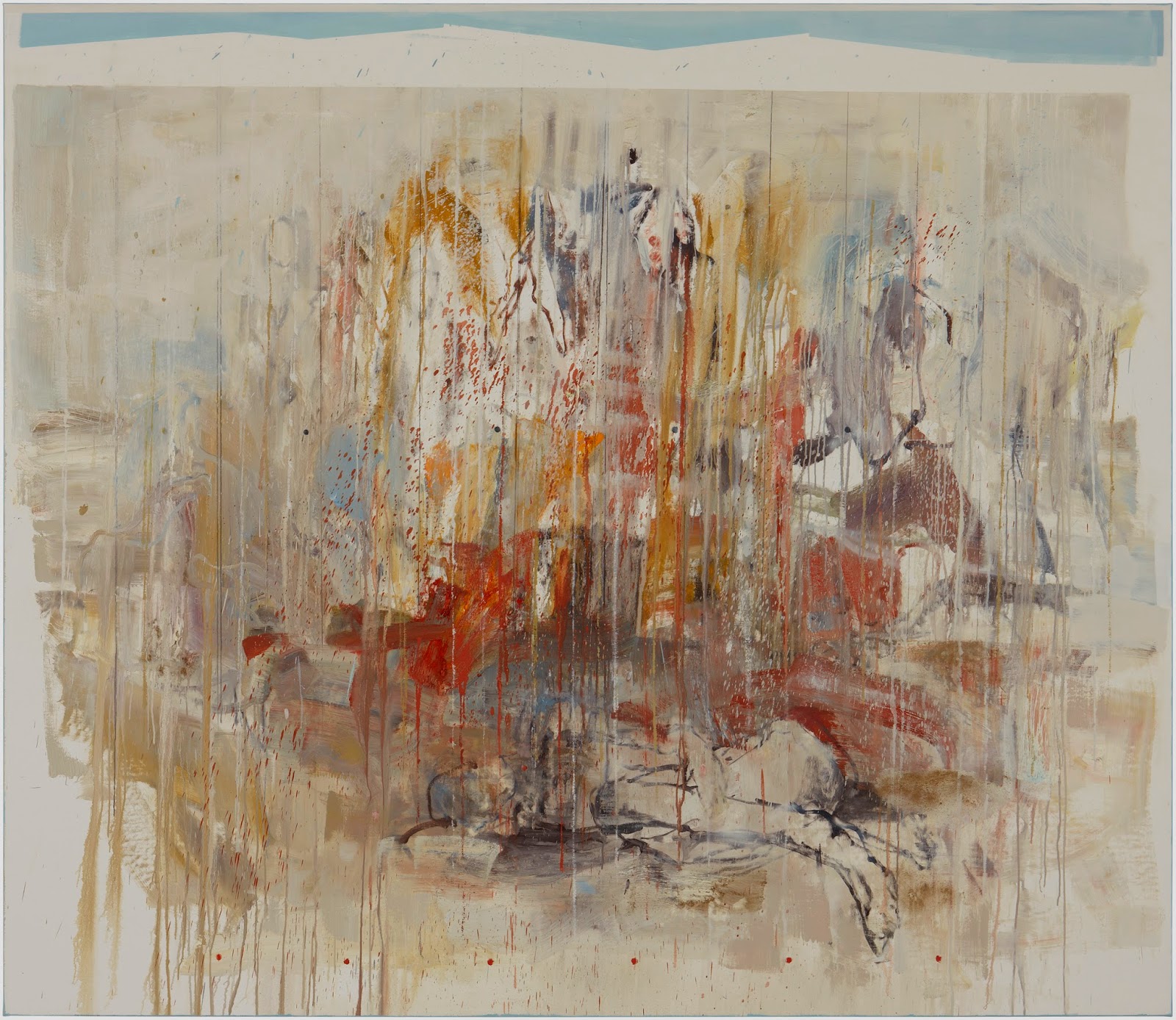 It is fitting that Turner is one of the first antecedents that comes to mind when looking at the large, richly coloured paintings of Cesare Lucchini, who was born in the same town exactly 100 years later. Currently exhibited at the Rosenfeld Porcini gallery in London, at first glance Lucchini’s paintings appear completely abstract. On closer inspection, amidst the colour there appears human forms, most mutilated, often disembodied, amidst the detritus of battle – barbed wire twisting over and into limbs.